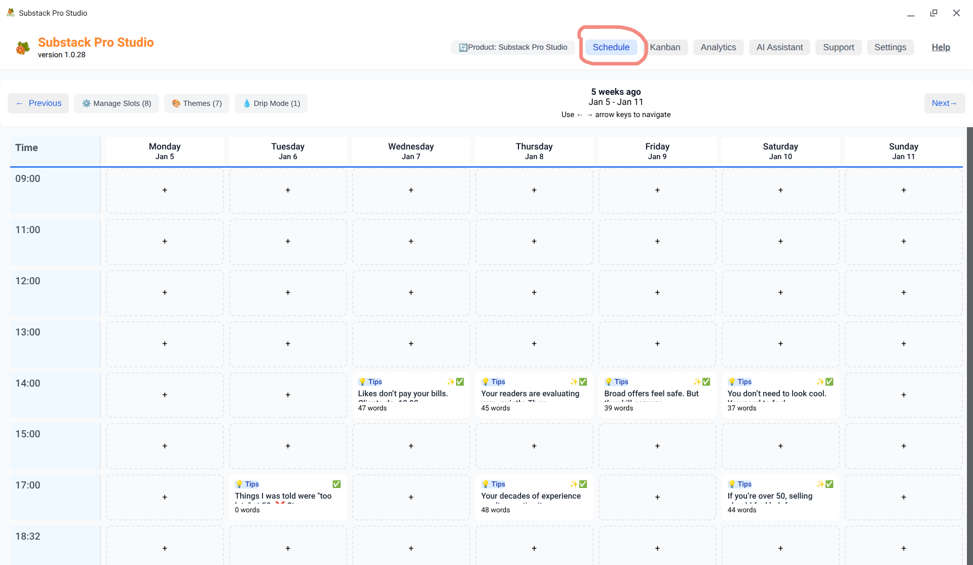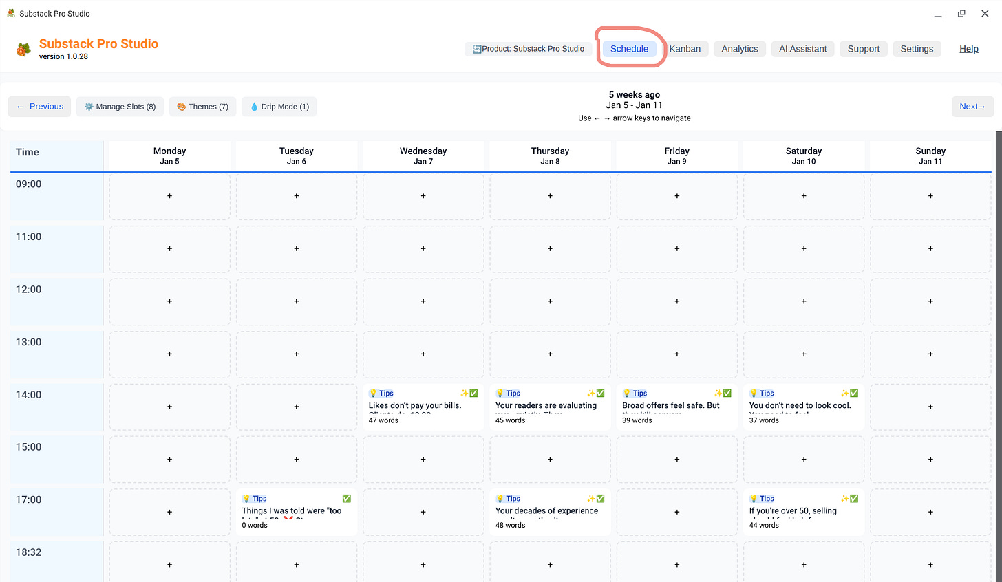 With Substack Pro Sudio I batch-create my Notes once a week. I sit down for 1-2 hours, pull the best insights from my recent newsletters, turn them into Notes, and schedule them.