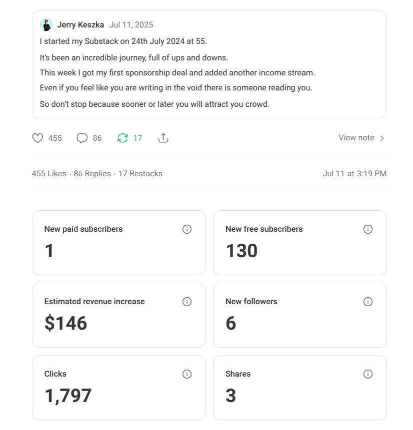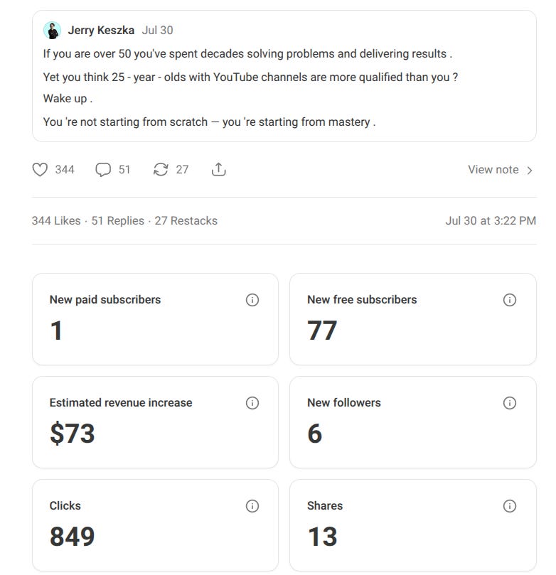 One of my newsletters, on leveraging your decades of experience to gain a strategic advantage, uses 12 Notes. Three of them brought in over 200 new subscribers combined.